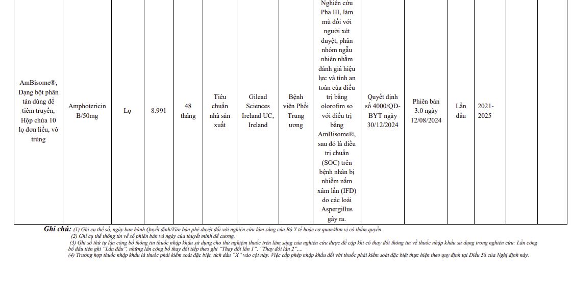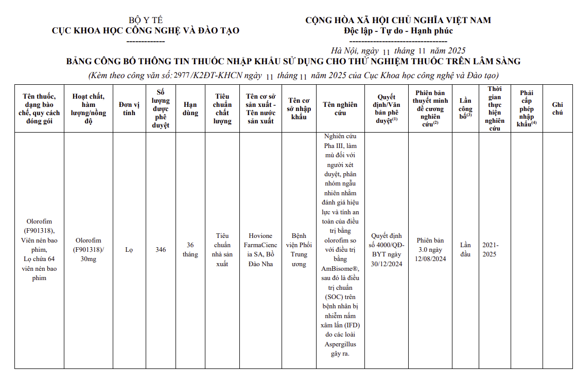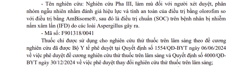Thông tin các thuốc nhập khẩu sử dụng cho thử nghiệm thuốc trên lâm sàng (MS: F901318/0041)