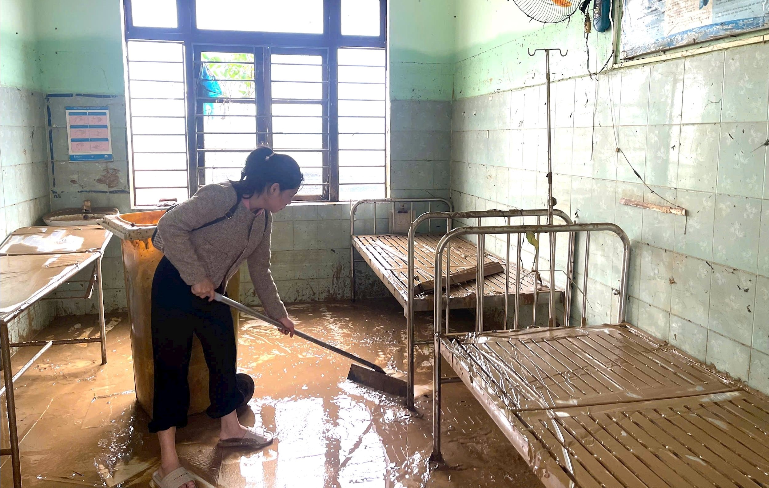 Nhân viên một cơ sở y tế dọn dẹp sau lũ.