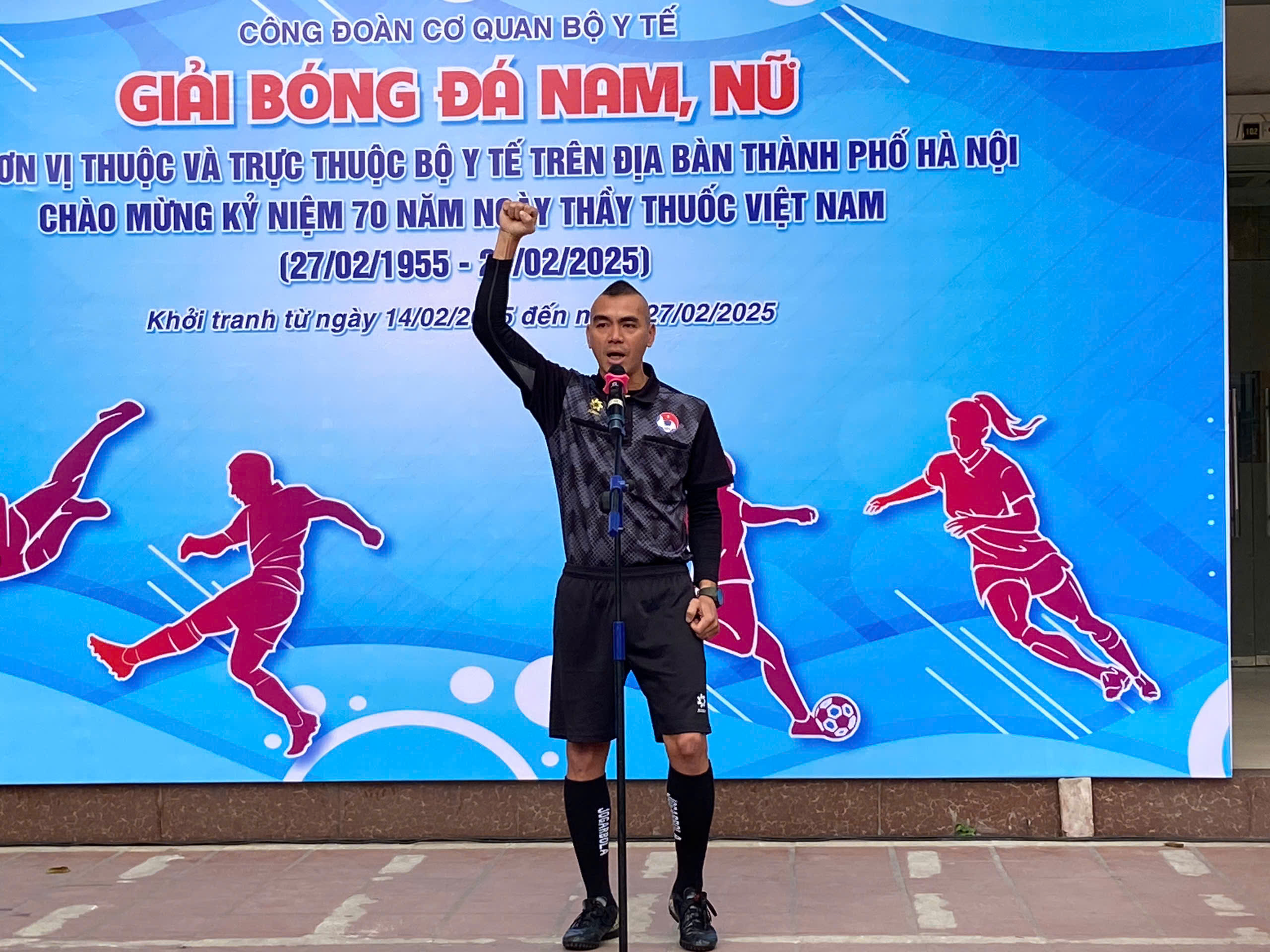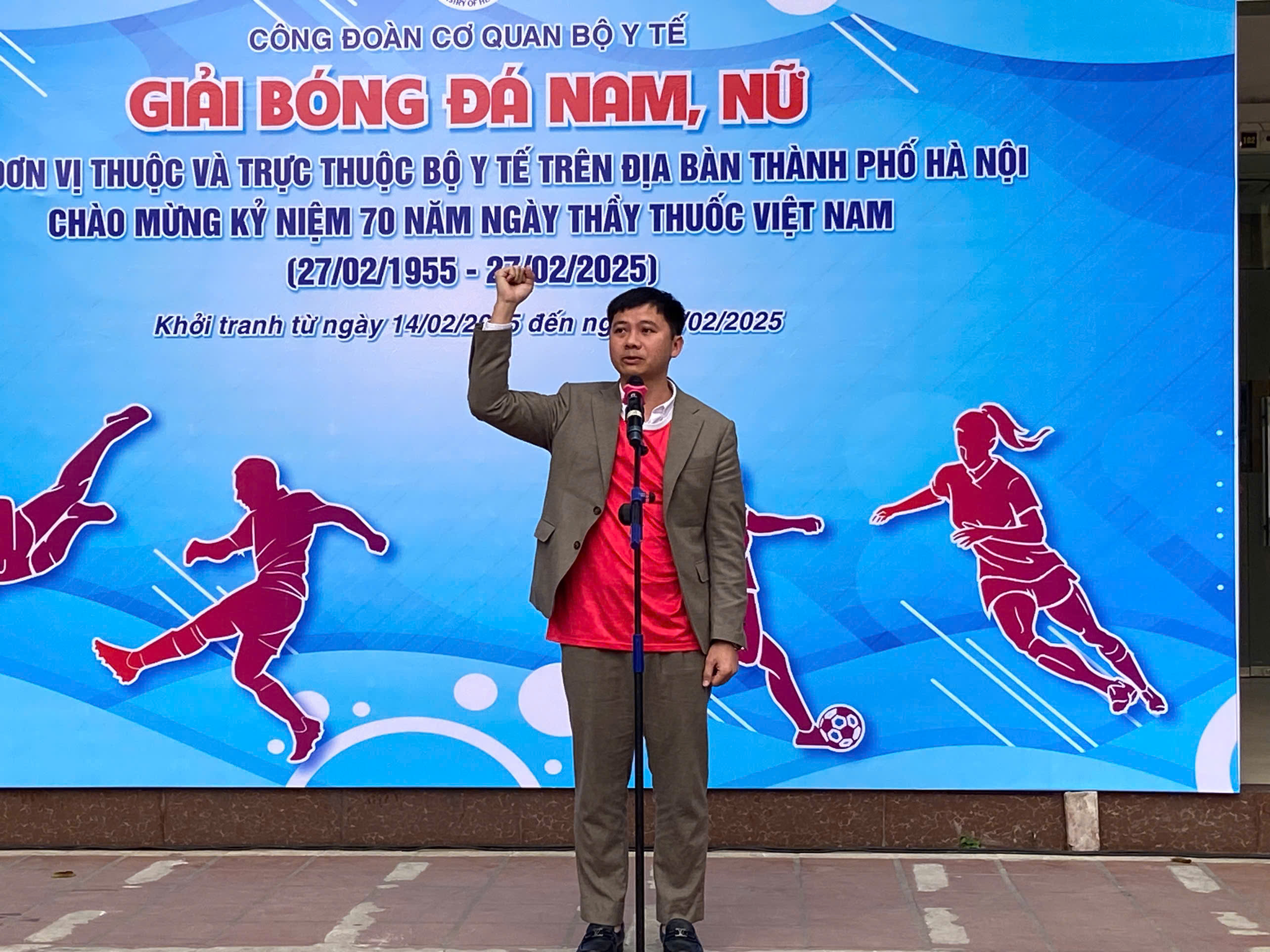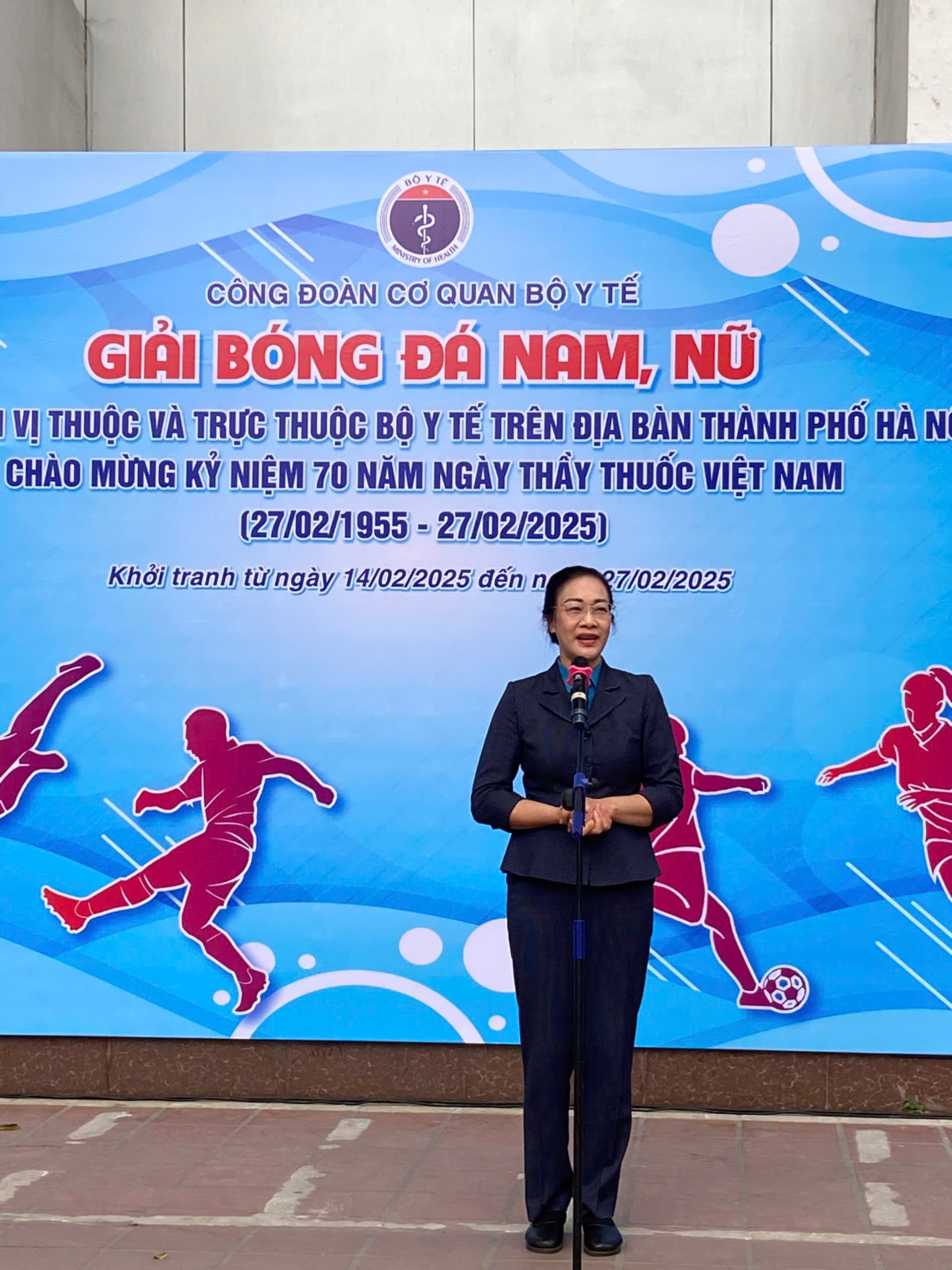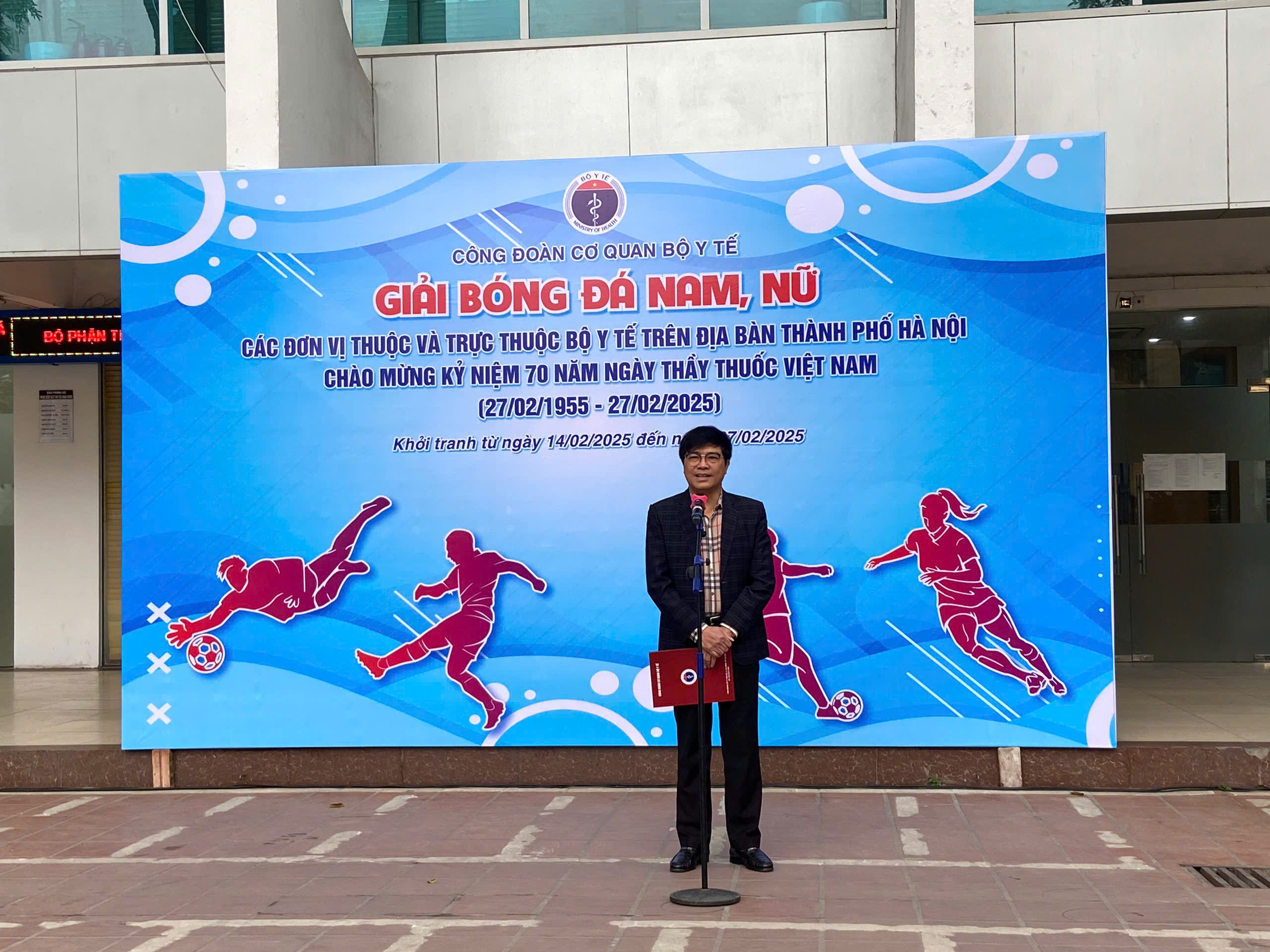 Phát biểu khai mạc buổi lễ, PGS.TS Nguyễn Tuấn Hưng, Chủ tịch Công đoàn Cơ quan Bộ Y tế cho biết: Nhằm thiết thực kỷ niệm chào mừng 70 năm Ngày Thầy thuốc Việt Nam (27/02/1955 - 27/02/2025), tạo sân chơi lành mạnh, tăng cường mối quan hệ, đoàn kết, giao lưu của cán bộ công chức, viên chức các đơn vị thuộc và trực thuộc Bộ Y tế trên địa bàn thành phố Hà Nội. Công đoàn Cơ quan Bộ Y tế tổ chức “Giải bóng đá nam, nữ giao hữu với các đơn vị thuộc và trực thuộc Bộ Y tế trên địa bàn thành phố Hà Nội chào mừng kỷ niệm 70 năm ngày Thầy thuốc Việt Nam”.