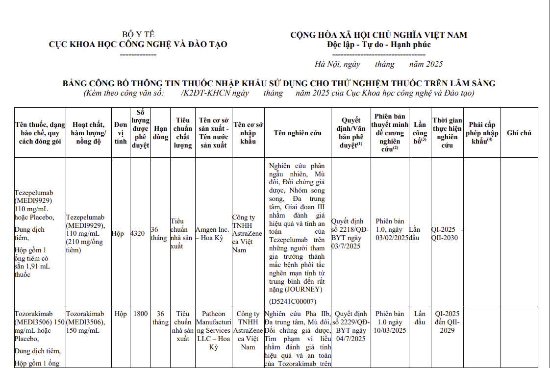 - Thông tin các thuốc nhập khẩu sử dụng cho thử nghiệm thuốc trên lâm sàng (Mã số: D8531C00002)