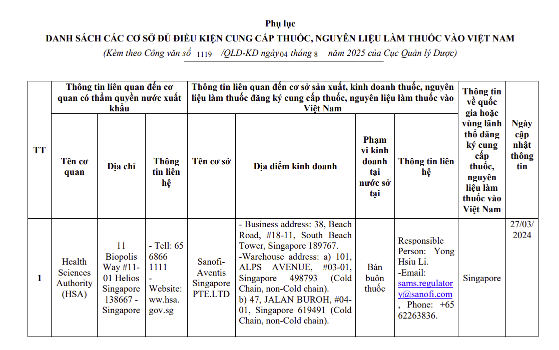 Danh sách các cơ sở đủ điều kiện cung cấp thuốc, nguyên liệu làm thuốc vào Việt Nam của Health Sciences Authority (HSA)