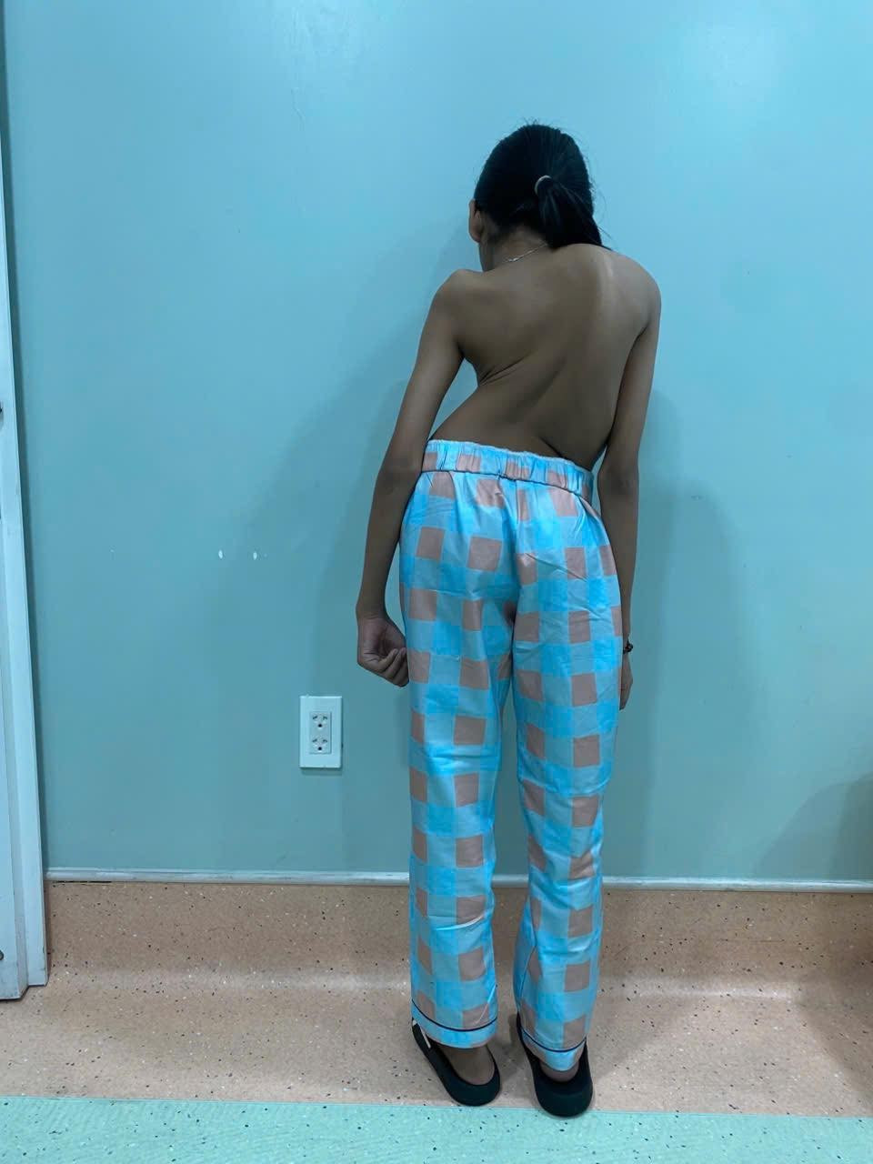 Trong thời gian chờ can thiệp, tình trạng của bé L. diễn tiến nhanh. Chỉ trong bảy tháng, độ vẹo cột sống từ 78 độ tăng vọt lên 104 độ, kéo theo đường cong thứ hai 80 độ ở vùng thắt lưng. Cột sống xoắn chặt như chiếc cầu thang xoắn khiến bé đau đớn liên tục, khó thở và hạn chế vận động. Mẹ bé chia sẻ nhiều lần chị run rẩy, không dám đặt bút ký giấy cam kết phẫu thuật vì sợ con không qua khỏi.