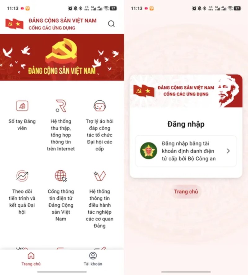 - Bước 2: Tiếp theo, người dùng chỉ cần mở ứng dụng, bấm vào mục Sổ tay Đảng viên - Đăng nhập bằng tài khoản định danh điện tử cấp bởi Bộ Công an. Lúc này, hệ thống sẽ tự động chuyển sang ứng dụng VNeID, bạn hãy điền thông tin đăng nhập
