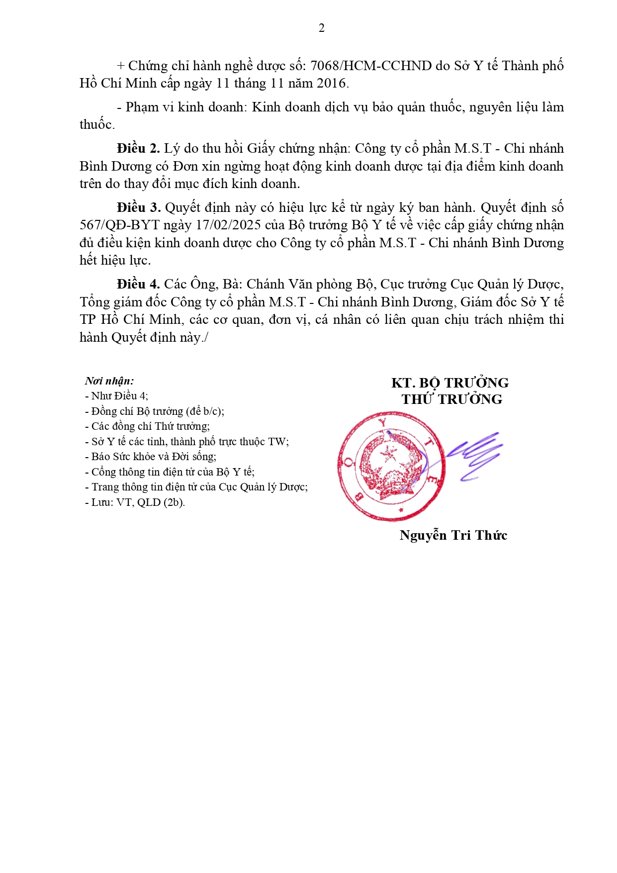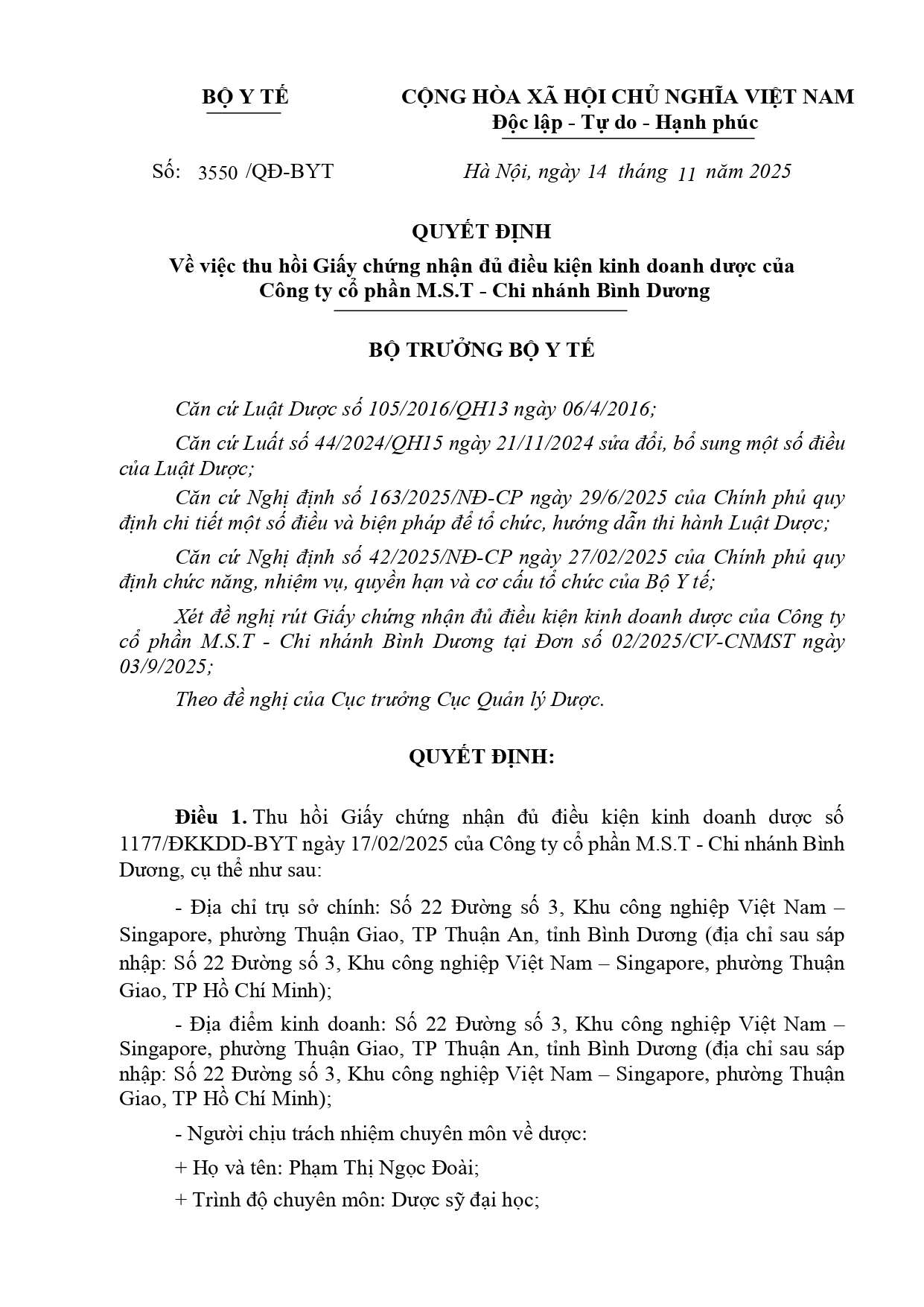 Thu hồi Giấy chứng nhận đủ điều kiện kinh doanh dược của Công ty cổ phần M.S.T - Chi nhánh Bình Dương