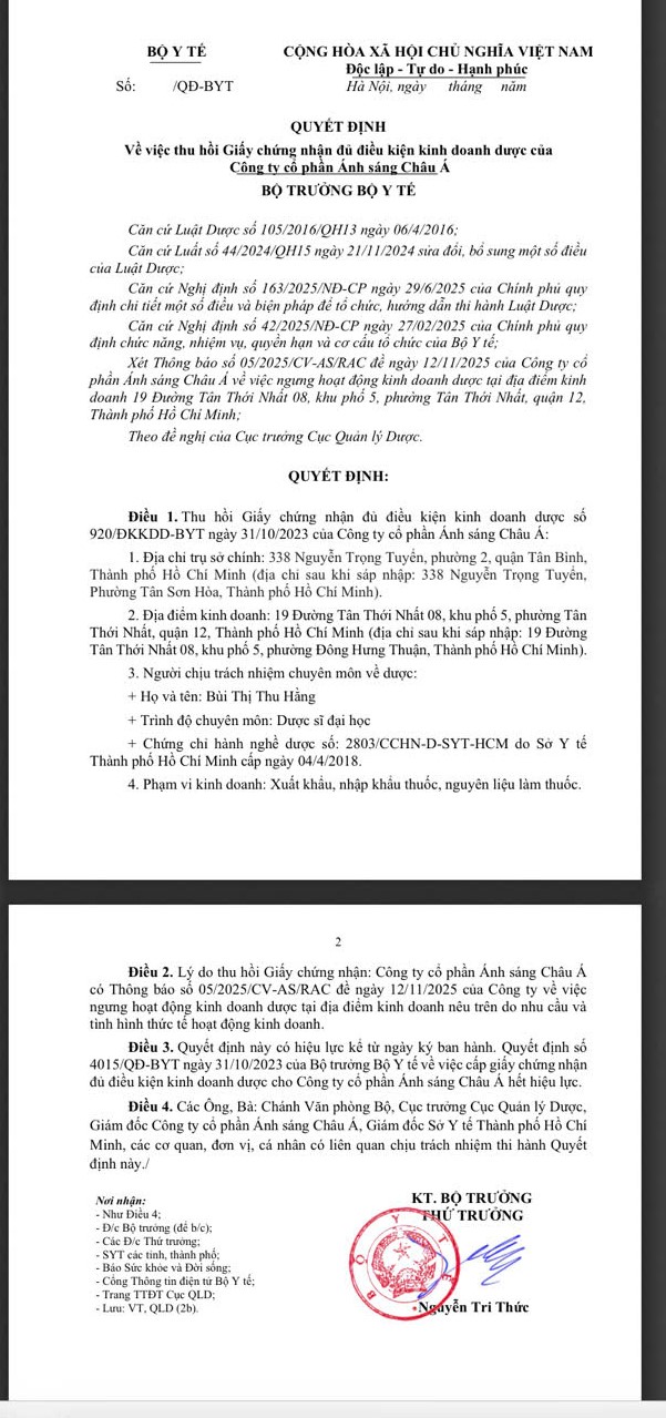 Ngày 12 tháng 12 năm 2025, PGS. TS Nguyễn Tri Thức, Thứ trưởng Bộ Y tế ký ban hành Quyết định số 3841 /QĐ-BYT về việc thu hồi Giấy chứng nhận đủ điều kiện kinh doanh dược số 920/ĐKKDD-BYT ngày 31/10/2023 của Công ty cổ phần Ánh sáng Châu Á.