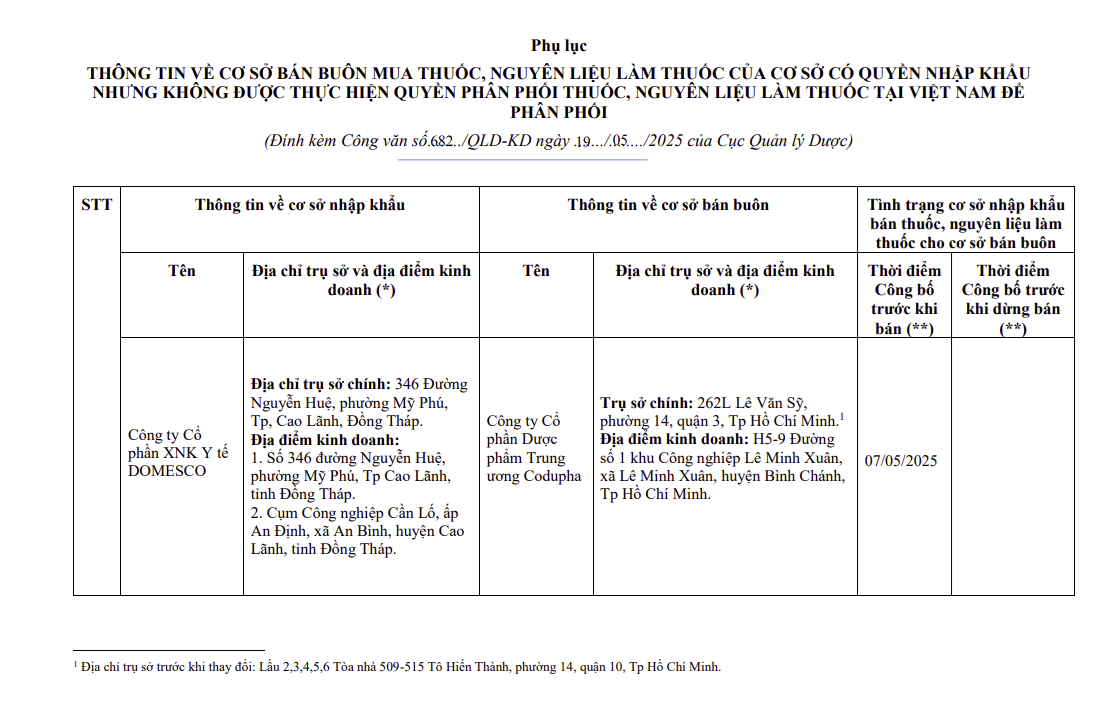 Thông tin về cơ sở bán buôn mua thuốc của cơ sở có quyền nhập khẩu nhưng không được thực hiện quyền phân phối thuốc, nguyên liệu làm thuốc tại Việt Nam để phân phối của Công ty Cổ phần XNK Y tế DOMESCO