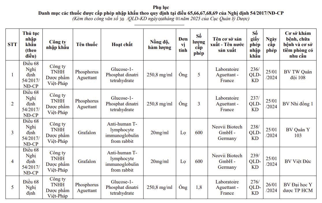 Danh mục các thuốc được cấp phép nhập khẩu theo quy định tại điều 65, 66, 67, 68, 69 của Nghị định 54/2017/NĐ-CP