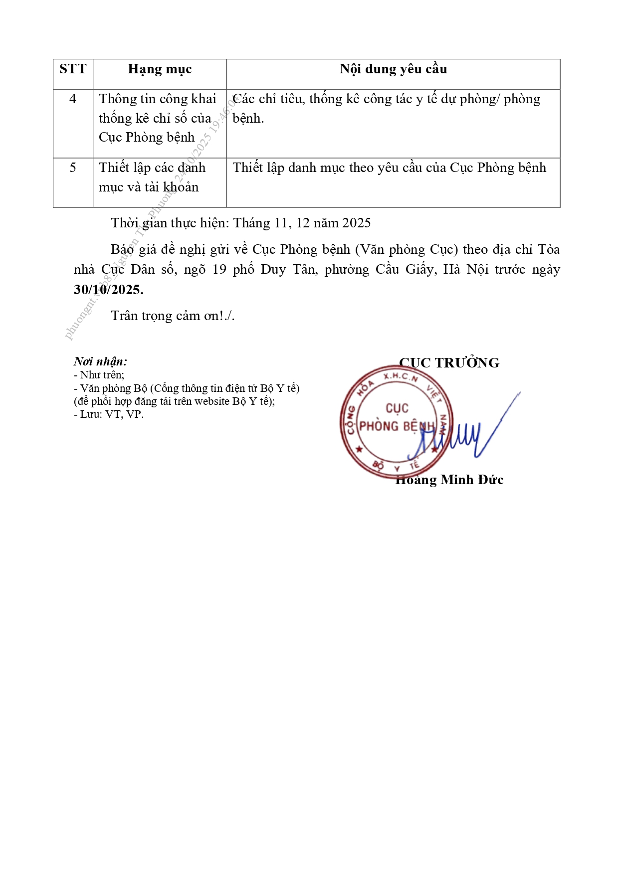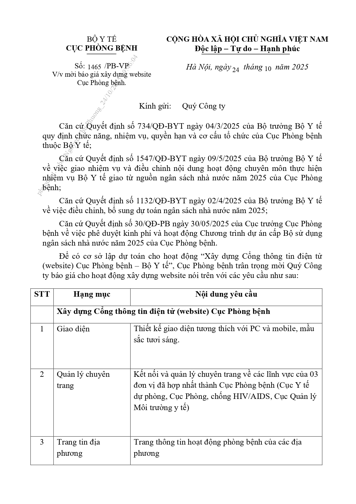 Cục Phòng bệnh thông báo mời báo giá hoạt động "Xây dựng Website Cục Phòng bệnh"