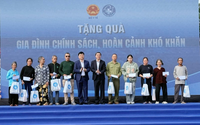 Thứ trưởng Bộ Y tế Trần Văn Thuấn và ông Phạm Văn Nghiêm, Phó Chủ tịch UBND tỉnh Hưng Yên tặng quà người dân có hoàn cảnh khó khăn, gia đình chính sách tại chương trình.
