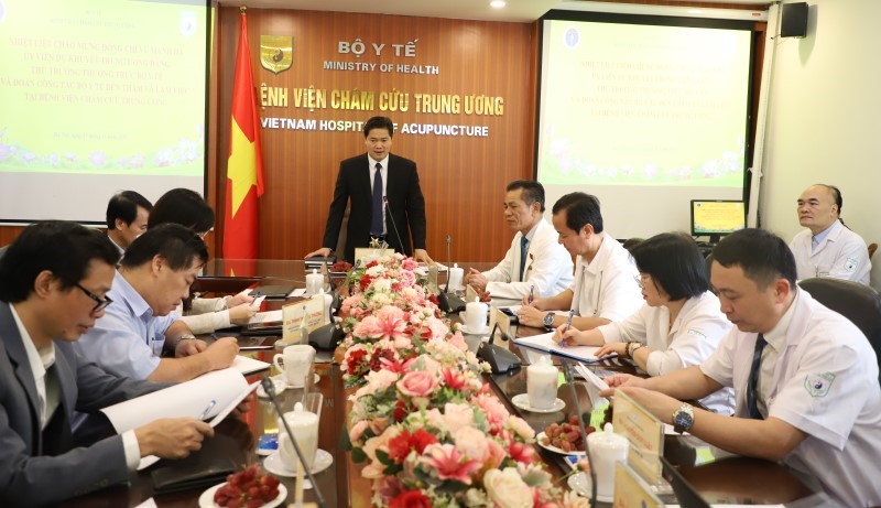 Tiếp và làm việc với đoàn có PGS.TS Trần Văn Thanh, Giám đốc bệnh viện và toàn thể Ban Giám đốc, lãnh đạo chủ chốt các khoa, phòng chuyên môn của Bệnh viện Châm cứu Trung ương.